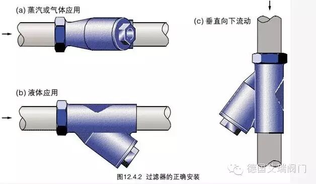虽然我们建议过滤器要安装在水平管道上,但如果流体向下流动,还是可以装在垂直管道上的,这样杂质碎屑就可以存留在过滤室中了(见图12.4.2(c)),但当流体向上流动时就不能垂直安装过滤器了,因为这样会使过滤掉的杂质落回管道内。